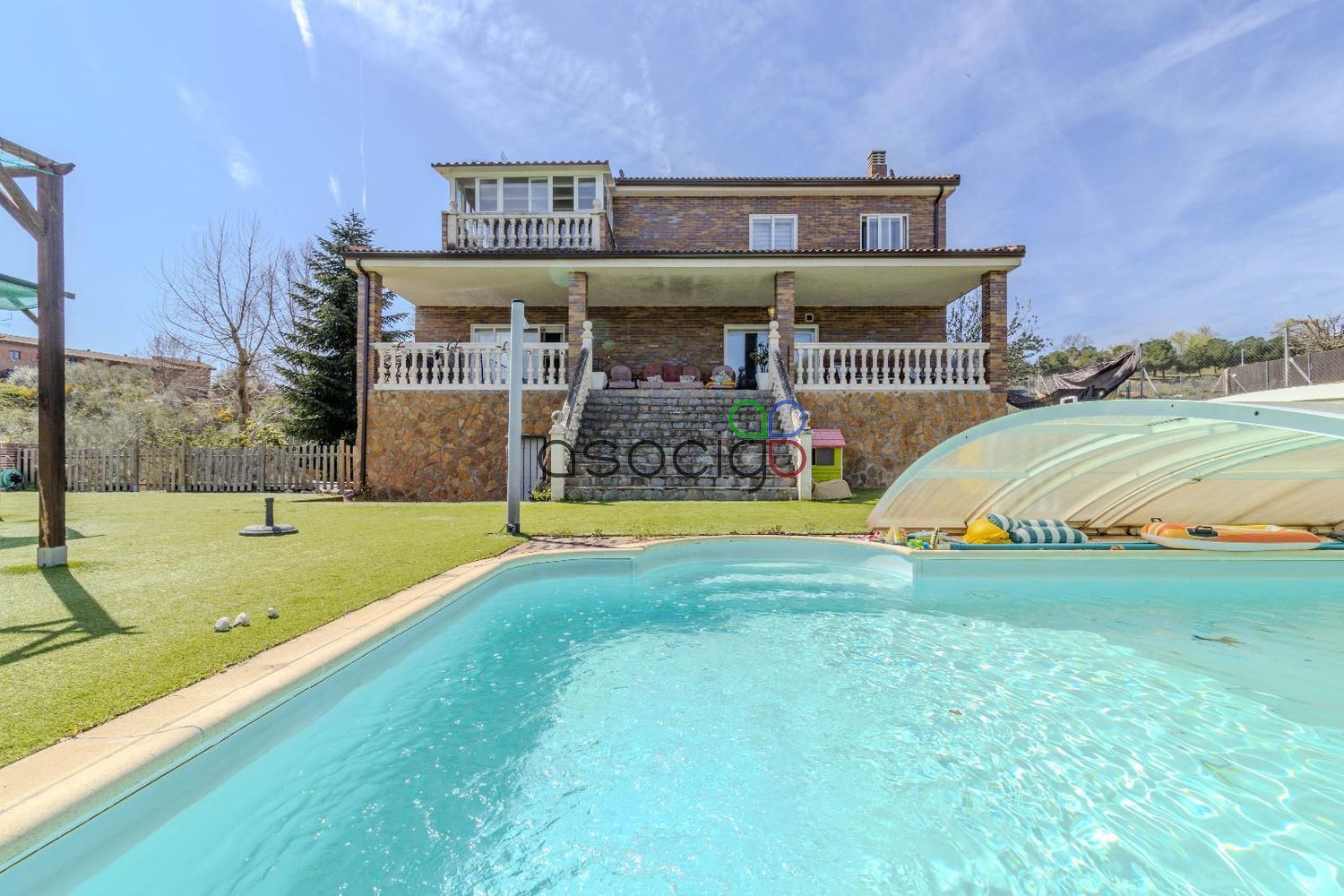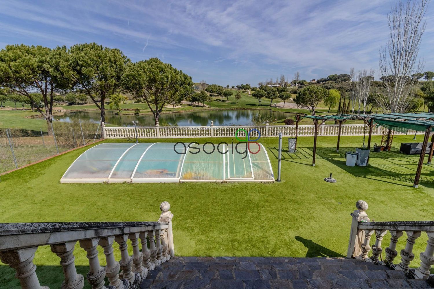 En el exterior, el jardín se convierte en un espacio ideal para disfrutar al aire libre, con una piscina cubierta que permite su uso prolongado durante el año y vistas directas al lago.